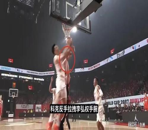 第一节,贺希宁提前起跳争抢篮板,科克手臂侵犯贺希宁起跳的圆柱体,造成肢体接触,裁判没吹;接着,李弘权断掉科克手里的球,科克反手拉拽李弘权的手腕,裁判还是没吹,给了日本队球权。