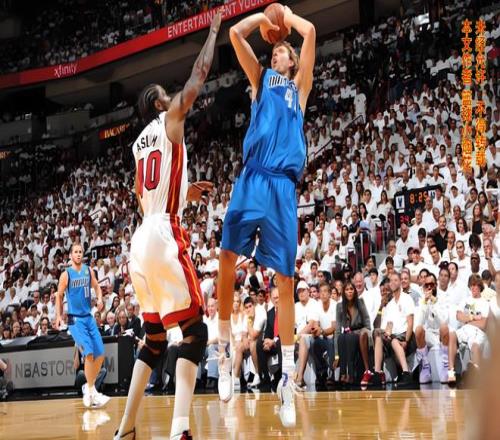 诺维斯基运了两次球,一个背转身连接一个小小的后撤步,重心向后拉,这个小连招是诺维斯基要施展金鸡独立前的预备动作!波什果然上当,他的重心向前一偏,诺维斯基马上低头运了一下球就往篮下冲,哐哐两大步冲到禁区,使用受伤的左手上篮打进!绝杀!小牛不可思议地逆转绝杀了热火!换个角度再来一张照片。