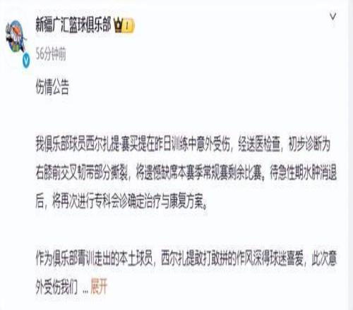新疆男篮本赛季第一阶段战绩仅仅排名联赛第十五名,连12强都没能打进,整体表现远低于俱乐部预期。在朱旭航和吴冠希两大主力相继赛季报销的情况下,新疆男篮本土阵容实力下滑非常严重,再加上外援阵容综合实力一般,新疆男篮本赛季冲击季后赛的希望非常渺茫。新疆男篮官方正式发布球员伤病公告,西尔扎提·赛买提在昨日训练中意外受伤,经送医检查,初步诊断为右膝前交叉韧带部分撕裂,将遗憾缺席本赛季常规赛剩余比赛。在连续三名主力遭遇重伤赛季报销的情况下,新疆男篮本赛季已经彻底陷入绝境。