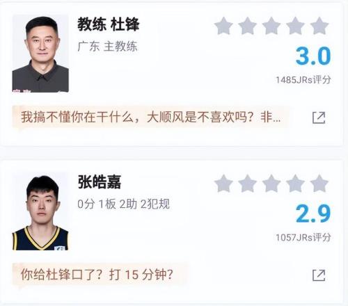 对于广东男篮的这场失利,媒体人“麦穗丰”也在社交媒体上表达了自己的看法。“麦穗丰”表示,广东男篮惨遭新疆男篮逆转,是在指挥端出现了大问题。虽然“麦穗丰”并没有提杜锋,但意思却非常明显。“麦穗丰”对杜锋的用人进行了质疑,表示让徐杰在第二阵容里担任纯投手的角色,这样的用法很离谱。决战时刻,(杜锋)同时派上张皓嘉和杜润旺,更是形同“自刎归天”。很多广东球迷也对杜锋非常不满,赛后给他打出了3.0的评分,这个分数已经非常低了。