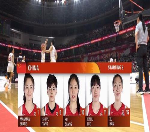 中国女篮首发为:中锋韩旭,前锋罗欣棫、张茹,后卫杨舒予、张曼曼。——中国队变阵,让张茹出战增加防守强度。