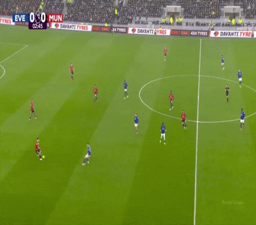 曼联前场四人组的自由度帮助球队将球推进到前场,如下面二月的1比0战胜埃弗顿的例子所示。