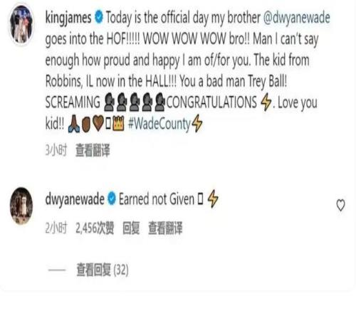 不过玩嗨了的詹姆斯没忘记好兄弟韦德,他还在社媒上艾特了韦德,又祝贺了一番,表示了一下兄弟情深,图片在下面,翻译一下,大体上的意思就是,哇哇哇,兄弟,我无法用言语来表达我对你有多么高兴和自豪,来自伊利诺伊州的孩子现在是名人堂巨星了,这是上天赐予你的荣耀,你这个坏家伙,我永远爱你。