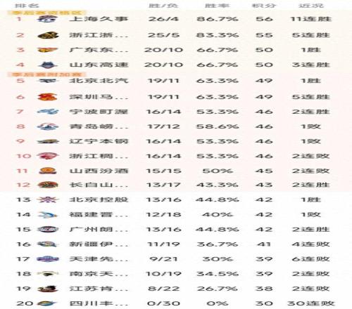 CBA最新积分榜:上海11连胜排第1,广东第3,北京第5,辽宁第9