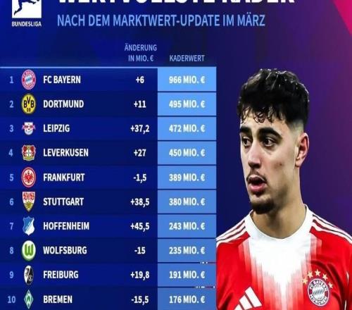 德转更新德甲俱乐部身价榜:拜仁9.66亿欧第1,多特4.95亿第2