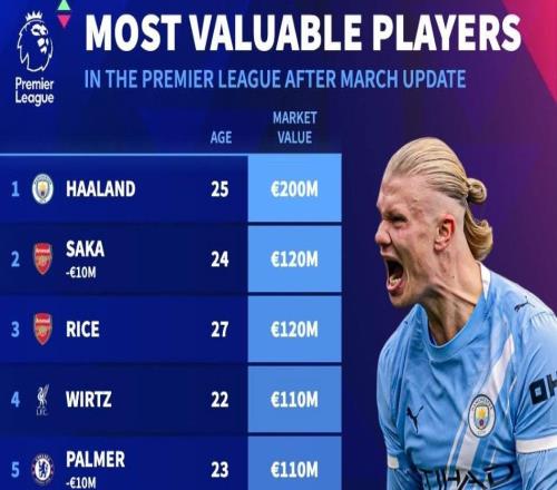 德转更新英超球员身价前10:哈兰德2亿第1,萨卡、赖斯1.2亿第2