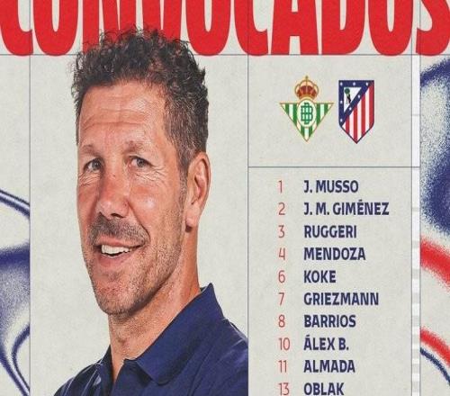 马竞客战贝蒂斯名单:格子回归,瑟洛特伤缺,3名新援均在列