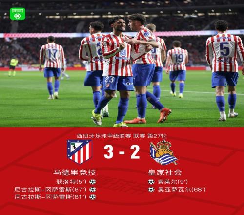 马竞32皇家社会,冈萨雷斯替补双响,瑟洛特、奥亚萨瓦尔破门