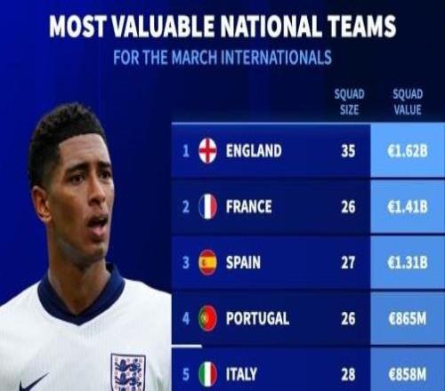 3月国家队身价排行榜:英格兰16.2亿欧元领衔,法国紧随其后